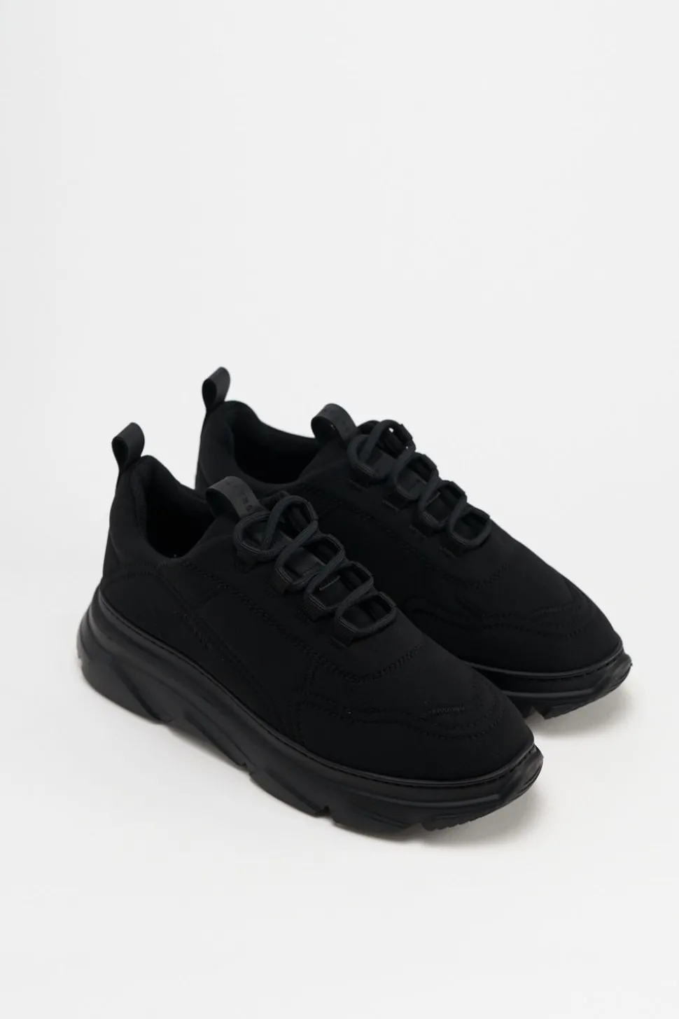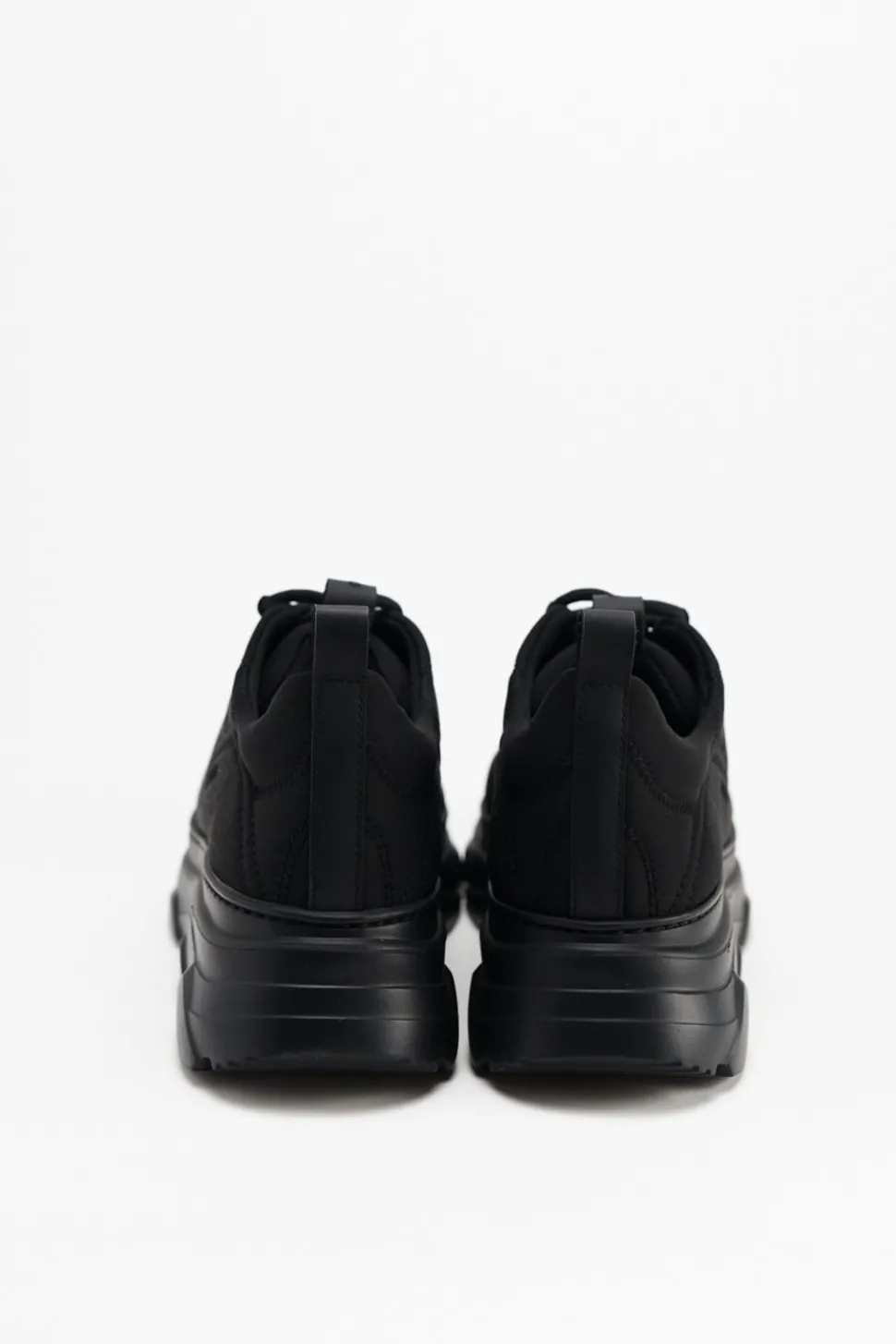 In Het Zwart. Lage Sneakers Gemaakt Van Een Mix Van Gerecycled Neopreen. Grof Silhouet. Contrasterende Elementen Met Geborduurde Details. Vetersluiting Aan De Voorkant. Logopatch Op De Tong. Subtiele Branding Aan De Buitenkant. Trek Het Lusje Aan De Achterkant. Ronde Dop. Dikke Platformzool Met Geometrische Details. Onze Iconische Sneakers In Een Nieuw Jasje.Materiaal