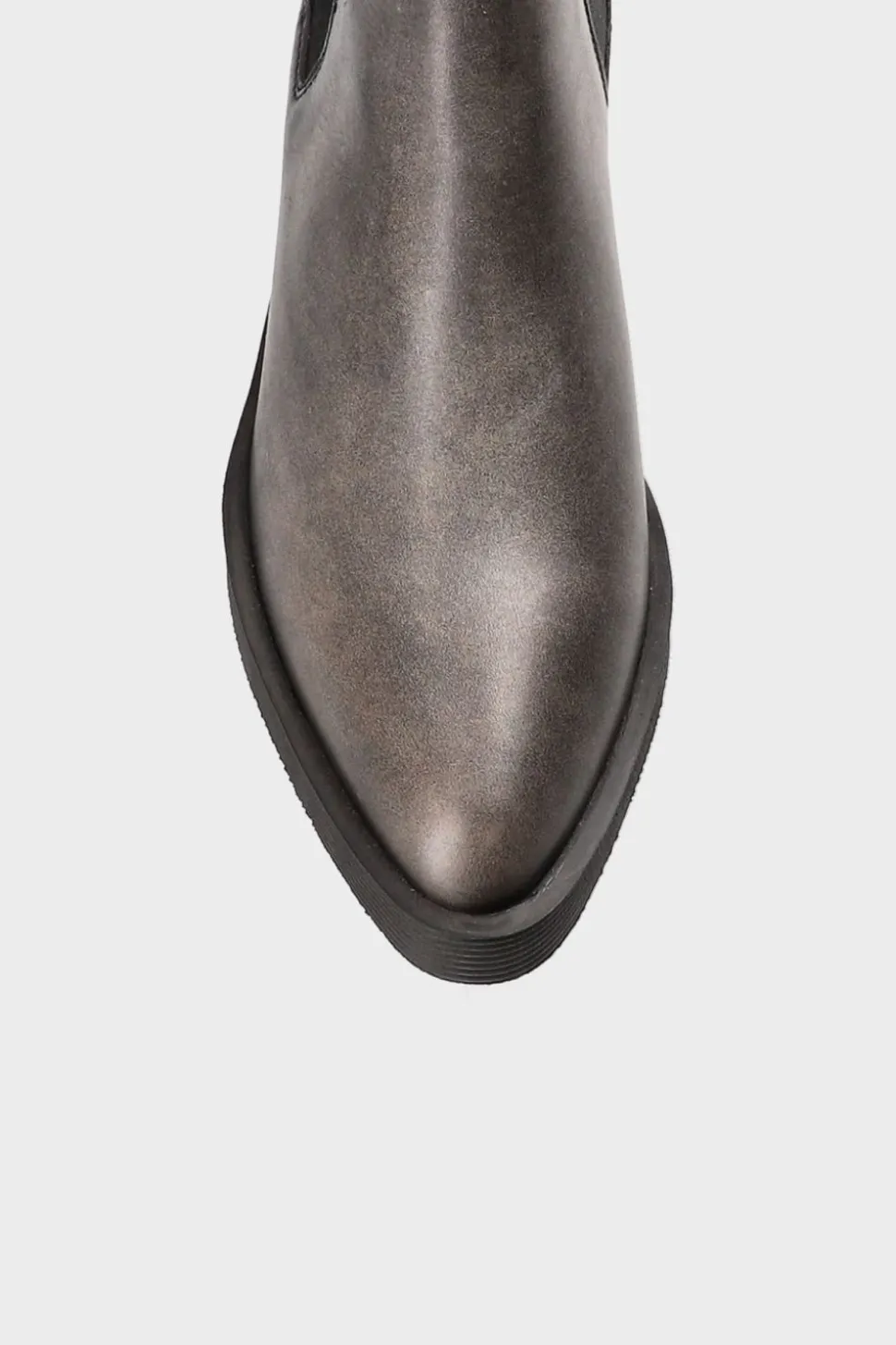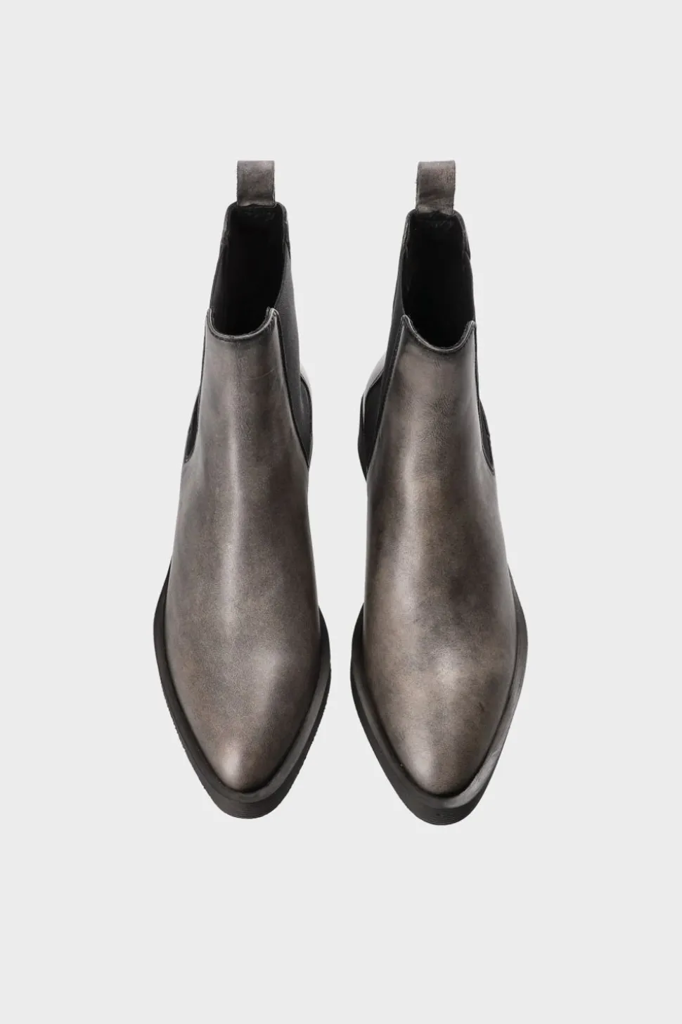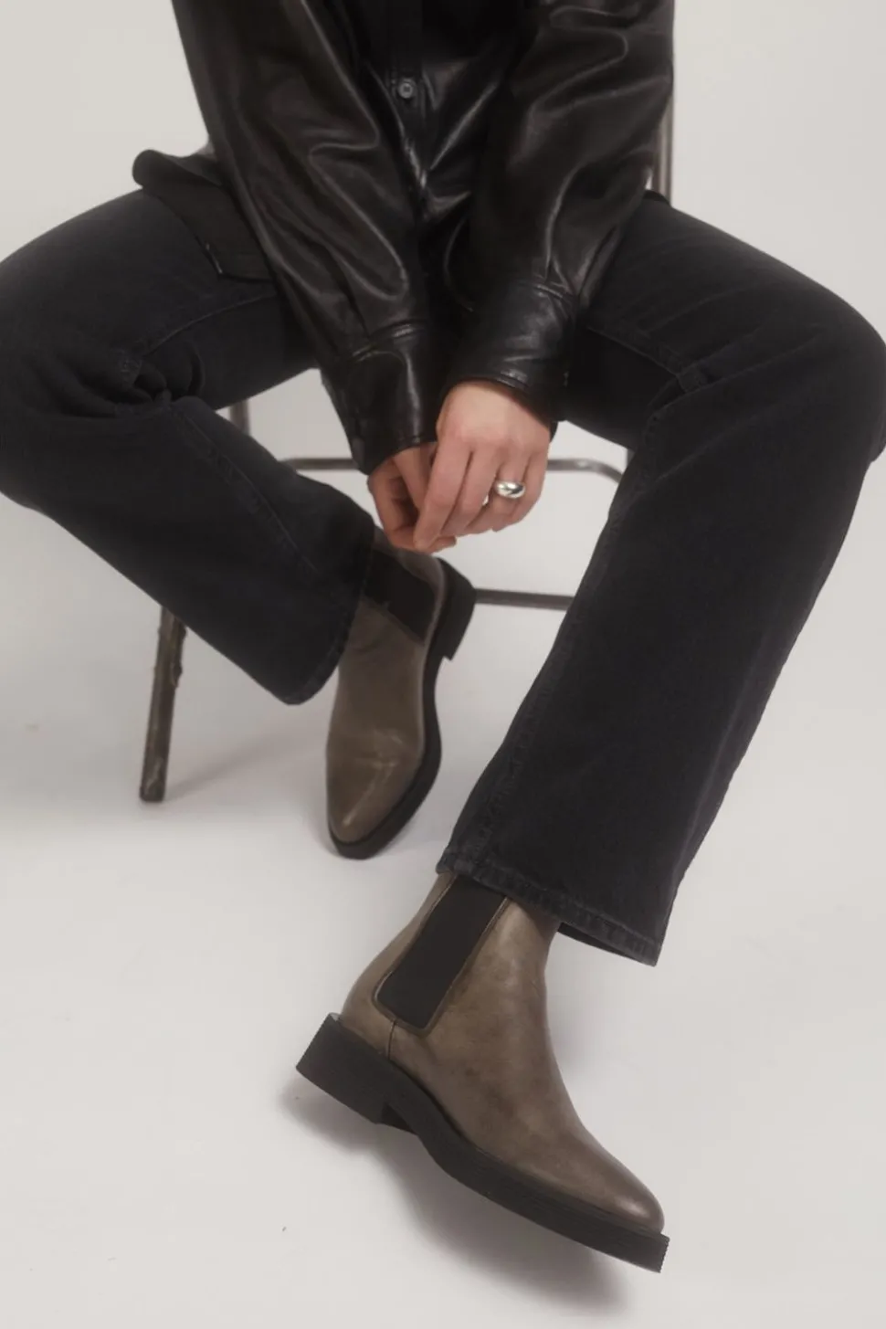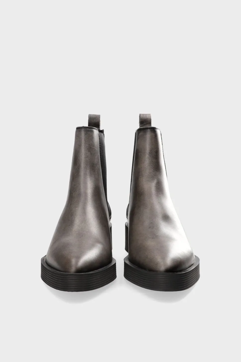 In Grijs. Enkelhoge Chelsea-Laarzen Gemaakt Van Gewaxt Nubuckleer. Minimalistisch Silhouet. Elastische Zijpanelen. Geborduurde Details. Trek Het Lusje Aan De Achterkant. Logo Aan De Buitenkant. Puntige Teen. Gladde Zool Die Goede Grip Biedt. Een Spits Vrouwelijk Model Dat Extra Comfortabel Is.Onze Schoenen Zijn Ontworpen In Kopenhagen En Gemaakt In Europa. Het Leer Is Afkomstig Van Geselecteerde, Door Een Familie Gerunde Fabrieken In Italië.